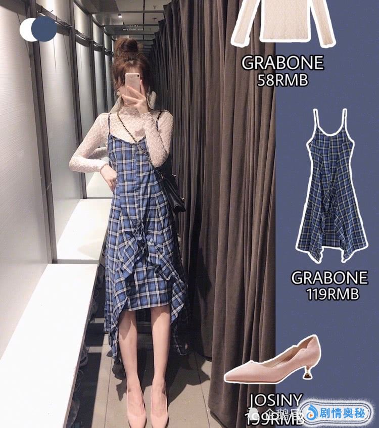 格纹吊带裙。不规则的设计真的很时尚,格纹有时很流行的元素,一点也不会过时,显得腿细长直。加一件蕾丝打底显得更甜美。