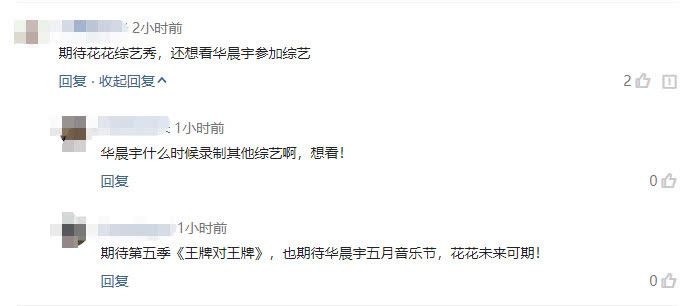 看到华晨宇5月行程满满,粉丝期待花花综艺秀,这位粉丝评论道:期待花花综艺秀,还想看华晨宇参加综艺。还有粉丝评论道:华晨宇什么时候录制其他综艺啊,想看!期待第五季《王牌对王牌》,也期待华晨宇五月音乐节,花花未来可期!如今综艺花暂时下线,歌手花闪亮登场,你会做他忠实的听众吗?
