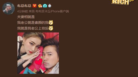 5月4日,郑云灿便又在V博晒出一张与老公欧弟的合照甜蜜秀恩爱,并附文:“夫妻相就是我老公就是素颜的我,我就是我老公上妆后”,隔着屏幕都能感受到他们的甜蜜。