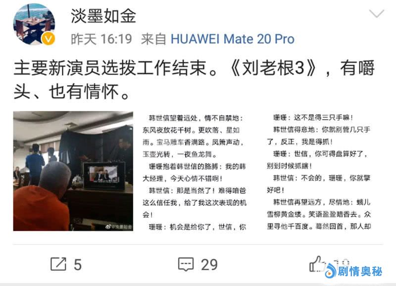 那么不妨分析一下,唐铁军不可能随意发一张演员试戏的图,再配上不相关的剧本内容。也就是说,第一张图中的演员红孩,应该就是饰演后面剧本中提到的韩世信,与女演员饰演的姗姗是一对情侣。这样看来,唐铁军发的应该是《刘老根3》的剧本了。