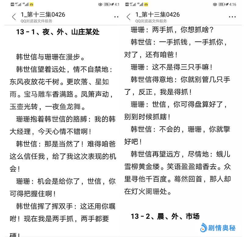 但是另外两张图却让人有些费解,是手机的截屏图片,显示的是一段文本内容,看情节应该是一个剧本,上面还标注着第十三集,体现的是其中第一镜的台词。