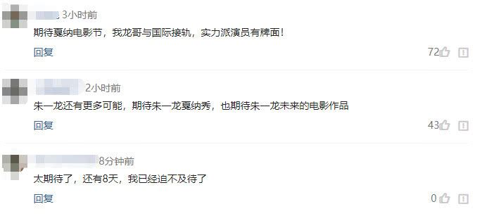 看到朱一龙行程更新,有“小笼包”评论道:期待戛纳电影节,我龙哥与国际接轨,实力派演员有牌面!有“小笼包”评论道:朱一龙还有更多可能,期待朱一龙戛纳秀,也期待朱一龙未来的电影作品!还有“小笼包”评论道:太期待了,还有8天,我已经迫不及待了。通过评论,我们可以感受到大家对朱一龙浓浓的爱,以及对他未来表现的期待。