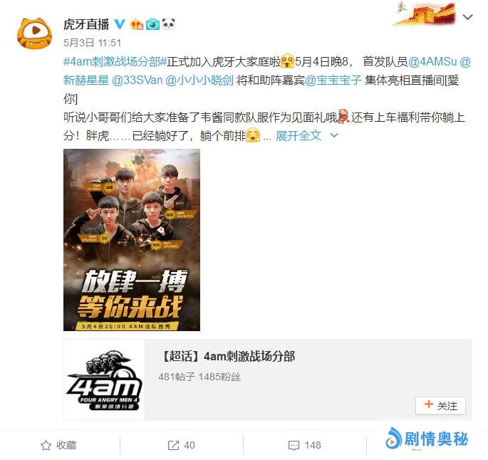 而就在最近4AM战队的刺激战场分部也是宣布加入虎牙直播平台进行直播。
