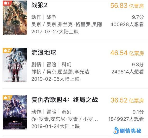 不过《流浪地球》的亚军地位不保了,近日全球热映的《复联4》在内地口碑票房双丰收,连破了25项中国影史纪录,除此之外《复联4》还获得了“全球最快突破10亿美元票房的电影”的吉尼斯世界纪录。如今《复联4》的内地票房已经突破了39亿,与《流浪地球》相差7亿票房,估计《复联4》超越《流浪地球》的票房纪录只是时间问题。