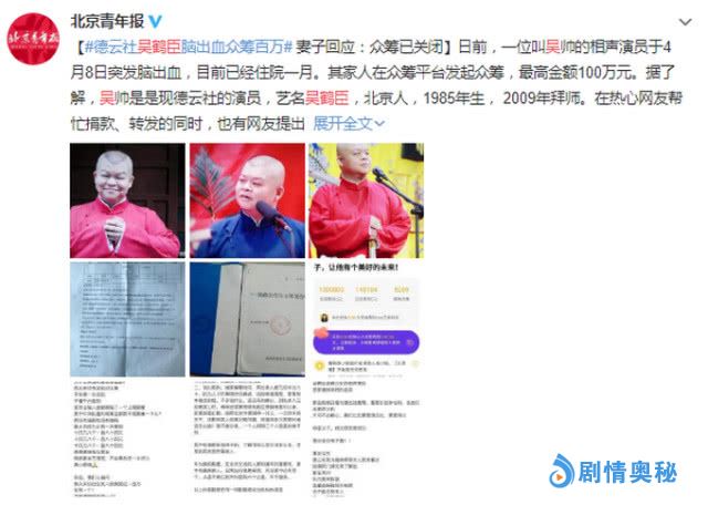 但是现在同样作为弟子的吴鹤臣突发急病,郭德纲袖手旁观这是做的的确是不合适。其实,这样的逻辑是不正确的。很多人都把众筹医疗费用和郭德纲袖手旁观联系在了一起,给人的感觉是因为郭德纲袖手旁观,才导致吴鹤臣妻子去众筹平台求助。