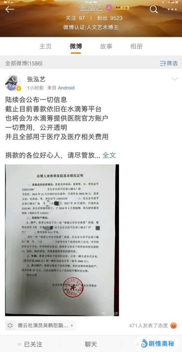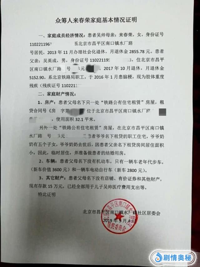 对此,吴鹤臣的妻子发微博解释了这件事,说网上扒出的那些说辞其实都是假的。房子的确有,但绝不是黄金地段,而是在六环以外。车也有,不过因为老人的腿脚不方便,所以不能卖。房子一套是在父母名下,一套是在已经过世的爷爷名下,也是卖不掉的。