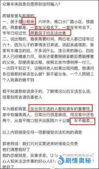因此,这样的流言完全站不住脚。不过,现在事情又发生了变化,矛头从郭德纲身上转移到了吴鹤臣夫妻的身上。起因就是有网友扒出了吴鹤臣的家境其实还不错,名下有房有车,而且还是北京市黄金地段的房子。如果真的是这样,那么发起众筹显然是不合适的。