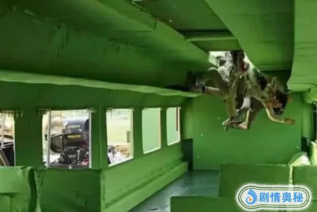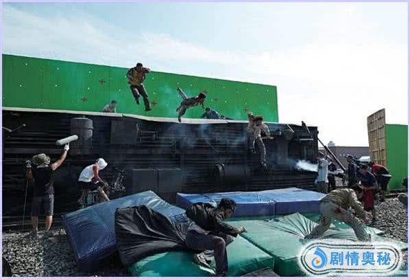 还有就是丧尸跳火车的这一幕,很多丧尸从火车顶上跳下来,看着就像是从火车上面跳过去一样,看着十分酷,丧尸跳得高度,堪比动作片的精彩镜头了。不过当去掉特效之后,我们看到的则是一个个僵尸从台子上跳到海绵垫子上的画面。