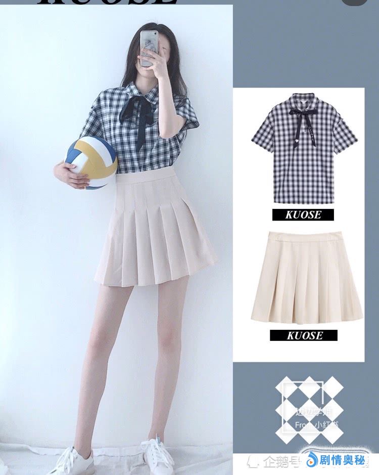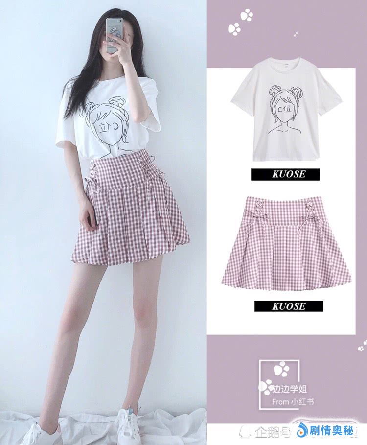 格纹上衣+米色百褶裙。百褶裙真的是减龄神器,显腿长的同时看起来更是青春无敌。这款更是裙裤的设计,完全不用担心走光。格纹上衣更是非常可爱,配上蝴蝶结感觉自己重返校园呢!