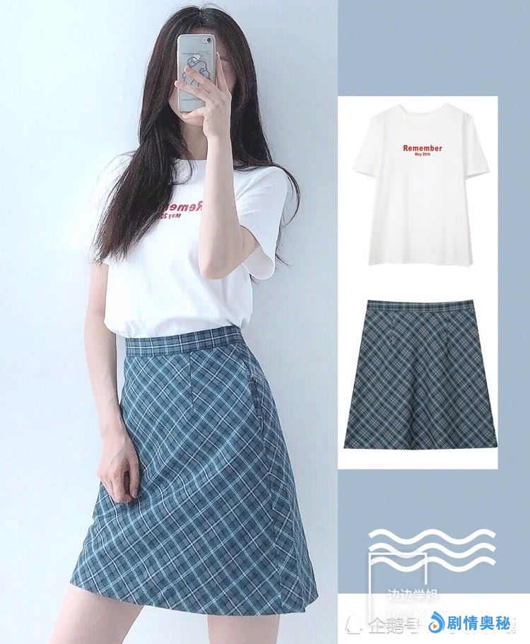 白色T恤+格纹半裙。蓝色搭配黄色,非常经典的搭配,简洁大方而且还很清爽,半裙更是很显腿长。格纹更是很流行的时尚元素,永不过时,任何时候都可以搭配,简单又高级。