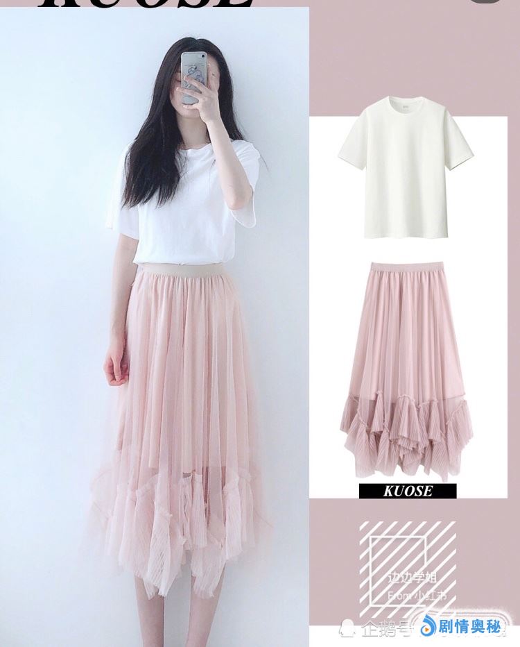 白色T恤+粉色纱裙。不规则的裙摆设计,非常的有个性,也是很流行的版型,走动起来更是飘逸十足,不会显的很死板。上身搭配简单的白T,更是简洁清爽。