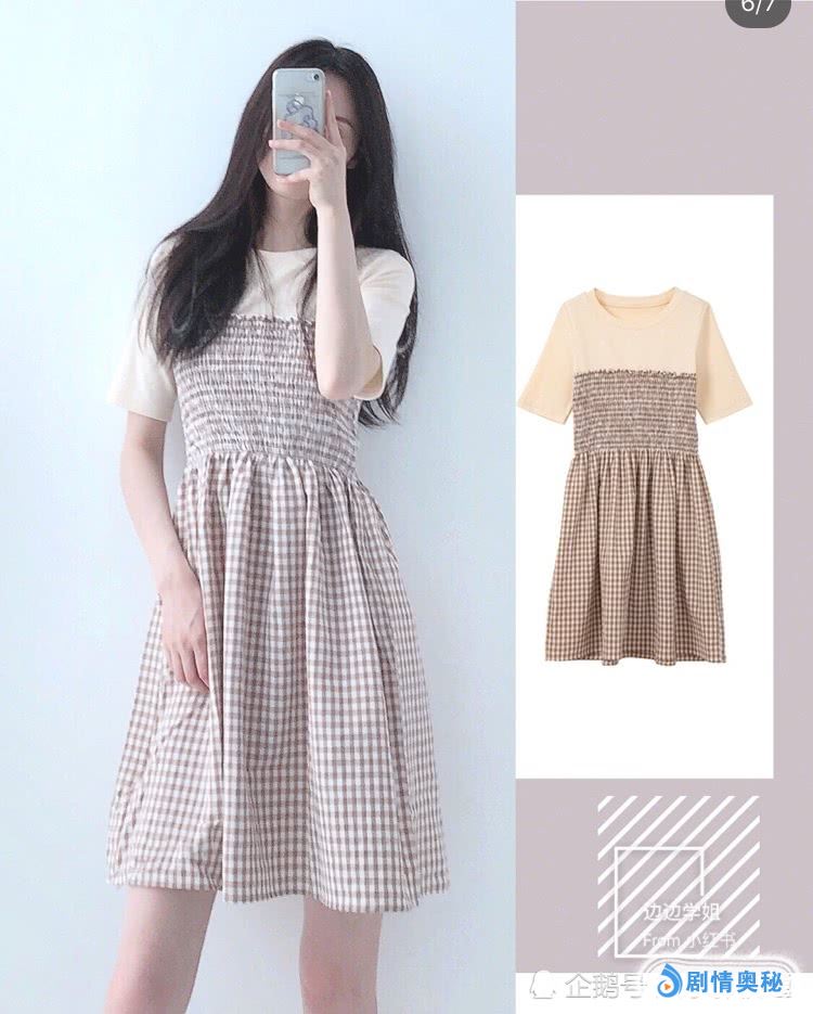 拼接连衣裙。T恤和半裙的拼接设计,非常的有个性,格纹元素看起来非常的小清新,色彩搭配一点都不突兀,更是显肤白,胸前的褶皱很遮肉,更是增强了视觉感,很显腿长。