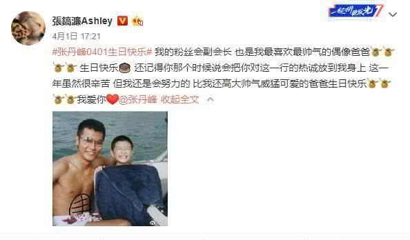 这条微博是今年四月一号祝张丹峰生日快乐的微博,在文中,他对张丹峰表白道:我爱你!不知道为什么这么多条微博,张镐濂偏偏只留了这一条,是否是因为对继父还有感情呢?众所周知,洪欣当时未婚先孕,莫少聪并没有怎么管自己的这个儿子。