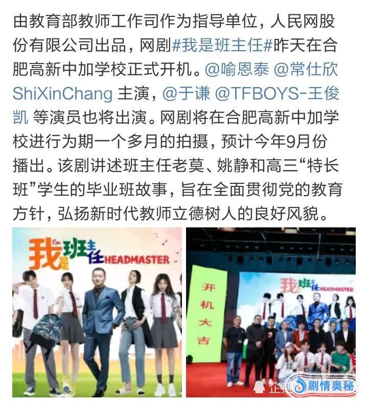 最近有一部新剧正在筹备当中,那就是由人民网股份有限公司担任出品的《我是班主任》了。这部网剧昨日在合肥高新中加学校正式开机,由知名演员喻恩泰和常仕欣主演,预计拍摄时间为一个多月,会在9月份上线播出。