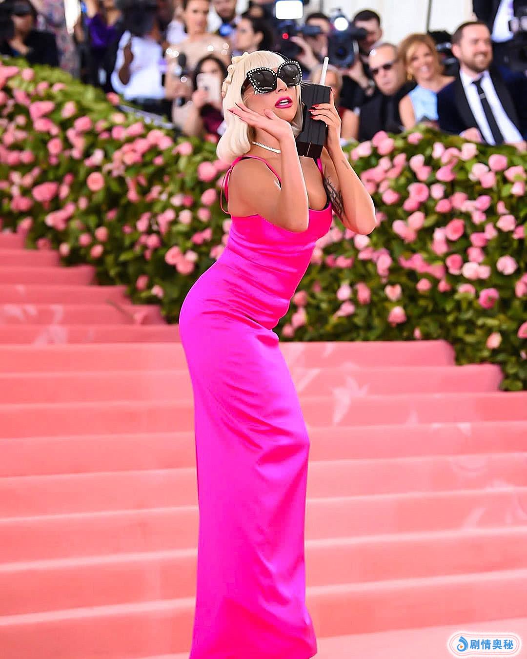 嘎嘎光是走楼梯已经用了16分钟,还上演边走边换装四次,十分敬业。只见她以一件超巨大的桃红色礼服登场,裙子的裙摆长达7米,金色的及肩长发弄成内扣造型,头顶上有几个蝴蝶结,搭配超浮夸又精致的妆容,有如真人芭比一样,超吸睛。