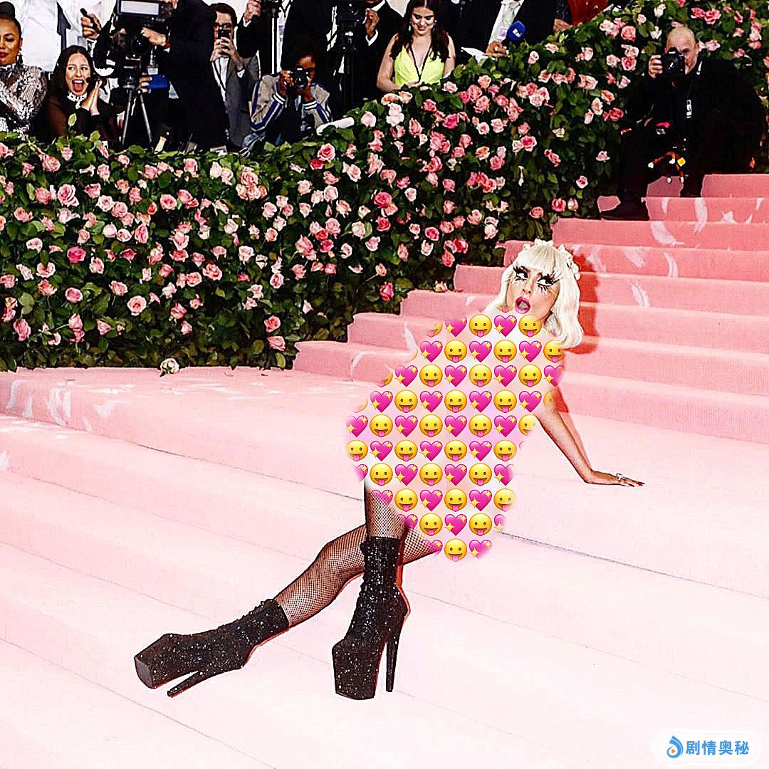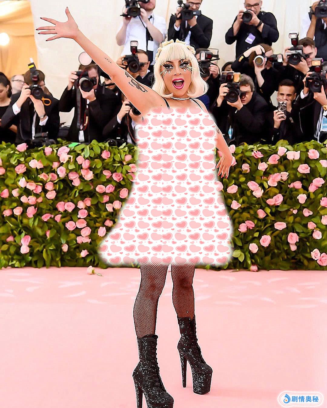 最后,嘎嘎又再次把长裙脱去,全身只剩下网袜、和一套under,甚至拉来桃红色的小拖车,上面摆满“行李”,画面有点逗趣。本以来她要结束红毯部分,谁知道她又直接躺在阶梯上,摆出各种性感的pose,让现场尖叫连连。