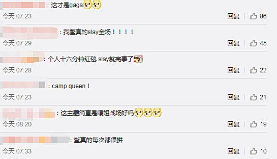 网友们都被她的“敬业”征服了,纷纷留言:“camp本人”“我鳖真的slay全场!!”“camp queen!”“鳖真的每次都很拼”“这主题简直是嘎姐战场好吗”“这主题简直是嘎姐战场好吗”…更有人表示,在知道主题是坎普风时,觉得嘎嘎已经赢定了,毕竟这就是嘎嘎的风格呀!你喜欢嘎嘎的浮夸造型吗?