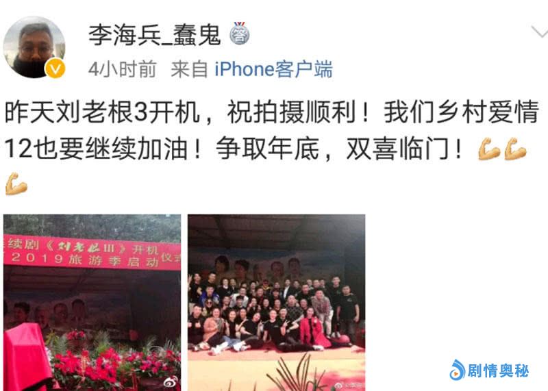 这段文字看似简短,实则包含了不少信息。第一,之前声称何庆魁亲自为《乡村爱情12》执笔,但因年纪关系,给他配了年轻的编剧来辅助完成,看来李海兵是其中之一;第二,李海兵说的双喜临门,其中一喜应该表明《刘老根3》会在今年播出;第三,如果《乡村爱情12》按照以往的规律,选择在8月份开拍的话,那么在年底的时候奉献给观众,也是有可能的,这是另一喜。