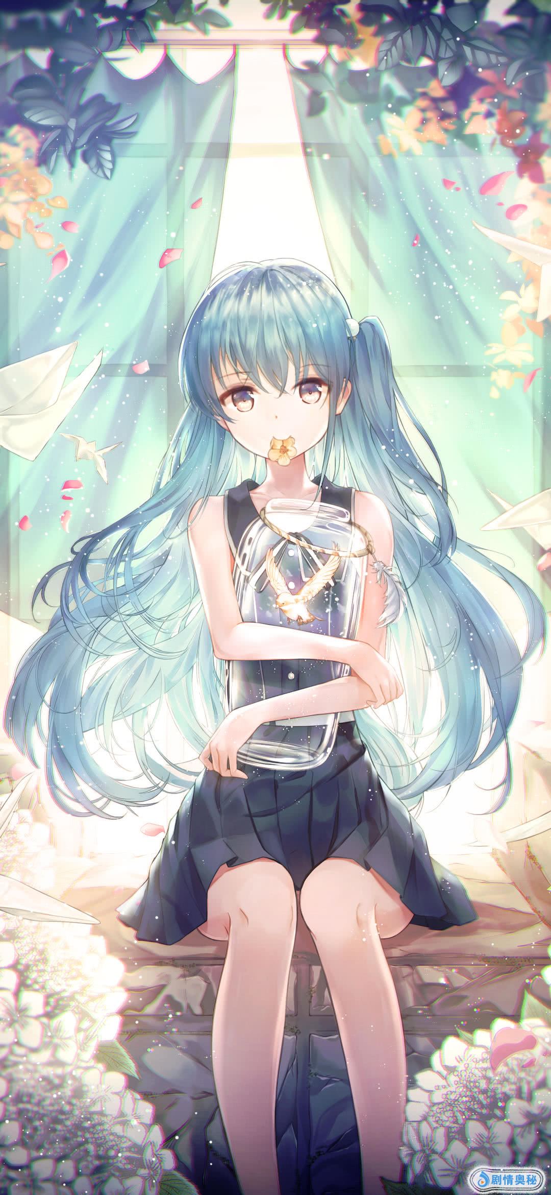 图片中的女孩染着蓝色的头发,坐在开满花的路边,手里抱着一个承载着回忆的玻璃瓶子,很是唯美,身边的千纸鹤在飞翔,不要因为生活中遇到一点挫折而气馁,不要因为身边的朋友已经找到了自己的另一半而仿徨,要始终带着一个信念,总有一天爱你的人,你的盖世英雄会踩着七彩祥云,以不经意间的方式出现在你的面前。