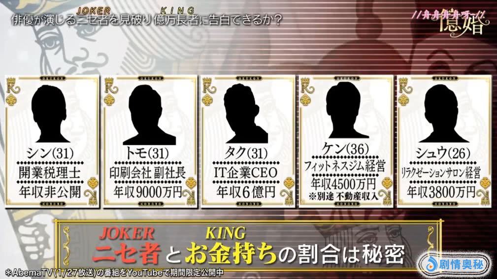 真富豪是King,假富豪是Joker,女生需要在相处中根据自己的判断选出真正的King。