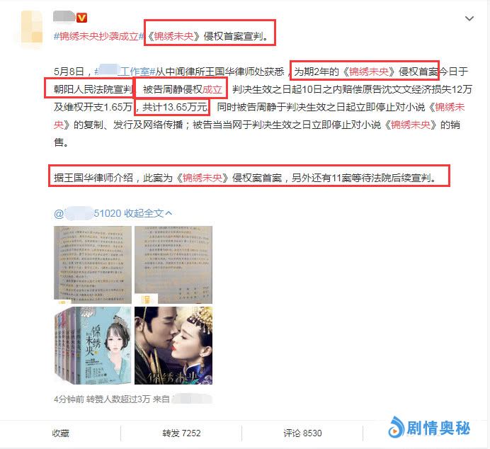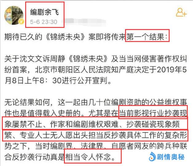 据沈文文代理律师王国华介绍,此案为《锦绣未央》侵权案首案,另外还有11案等待法院后续宣判。小编相信,有了第一起维权官司的胜诉,剩下的11案也终将真相大白。只是不知道还要经历多少个“两年”的等待?