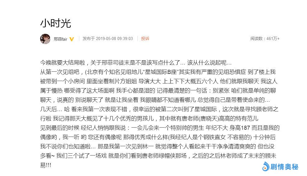 还是难免会有一些感触,这不在这部剧中饰演了女主司徒末的邢菲就在今天发布了一则千字长文感慨和纪念这部《致我们暖暖的小时光》,文章中她从最开始选角谈到初见林一、唐晓天的印象,再到后来拍摄以及现在即将说再见,字里行间其实也能看出来她对这部剧的看重和不舍。