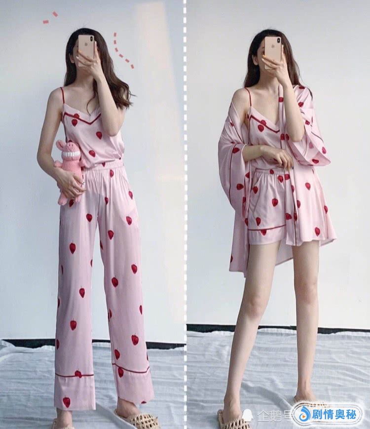 草莓图案丝质四件套。上身就是丝滑柔顺,下装短裤的长度和宽度刚刚好,四件套可以穿出不一样的感觉,吊带和长裤的搭配外穿毫无压力,非常的甜美。