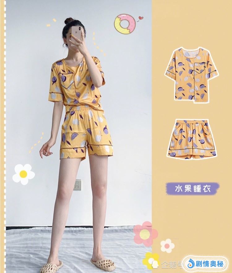 金色水果图案睡衣。面料依旧是丝滑柔顺,柔软又舒适。这套的颜色更加大方,夏天穿个凉鞋就可以出门了,虽然是水果图案配色,但一点不会小可爱风,相反非常的大气。