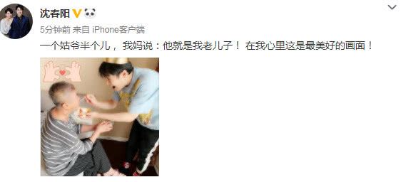 5月8日,沈春阳也在V博晒出一张老公小沈阳与妈妈的合照。从沈春阳晒出的照片中可以看到,身为寿星的小沈阳头戴生日帽,身着浅蓝色T恤搭配黑色运动裤脚踩拖鞋,一身居家装扮,左手捧着一块生日蛋糕,右手拿着小叉子,弯着腰正在喂坐在床上的岳母吃生日蛋糕。