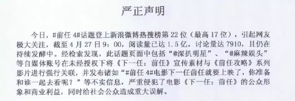 “严重侵犯了电影《下一任:前任》的公共形象和商业利益”。