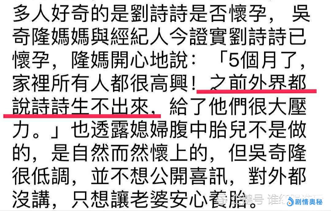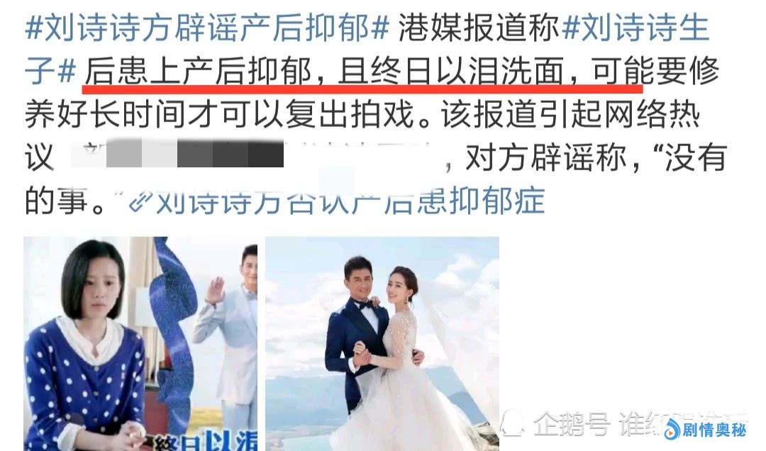 除了这些,作为当红花旦的刘诗诗,怀孕期间的糟心事可不少。首先是公布喜讯的时候,刘诗诗婆婆特意出面接受采访,并表示之前外界说诗诗生不出来,给了他们很大压力。这个传言确实有,但说的并不是刘诗诗,而是吴奇隆。也因为如此,有网友猜测产后抑郁并非空穴来风,只是和婆婆相处久所导致的。而关于刘诗诗怀孕之类的消息,女方从未主动公布过,都是男方或者男方的妈妈在公布,可见并不是刘诗诗想炒作。