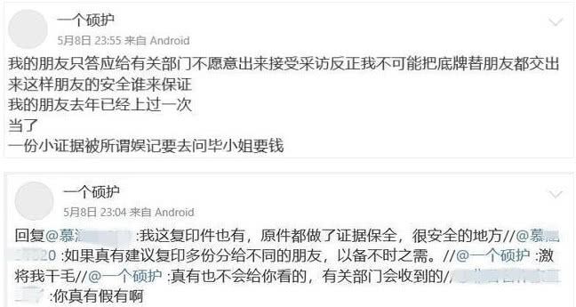 看他微博所发内容并不像是网友蓄意恶整,称是替朋友爆料,还表示朋友去年已经上过一次当,爆料证据中途被毕滢买走。另外表示目前所有的证据都收集完毕,原件被放在了很安全的地方,复印件已经提交给有关部门。