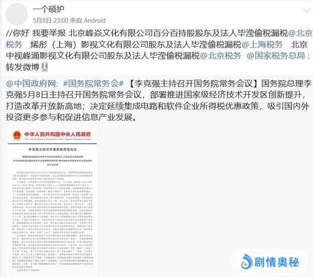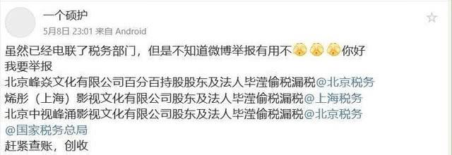 令人意想不到的是,近日微博上有网友举报北京峰焱文化有限公司存在偷税漏税的情况,并且还特意强调该公司百分百持股股东及法人是毕滢,这位网友还很专业的艾特了北京税务局和国家税务局等相关机构。