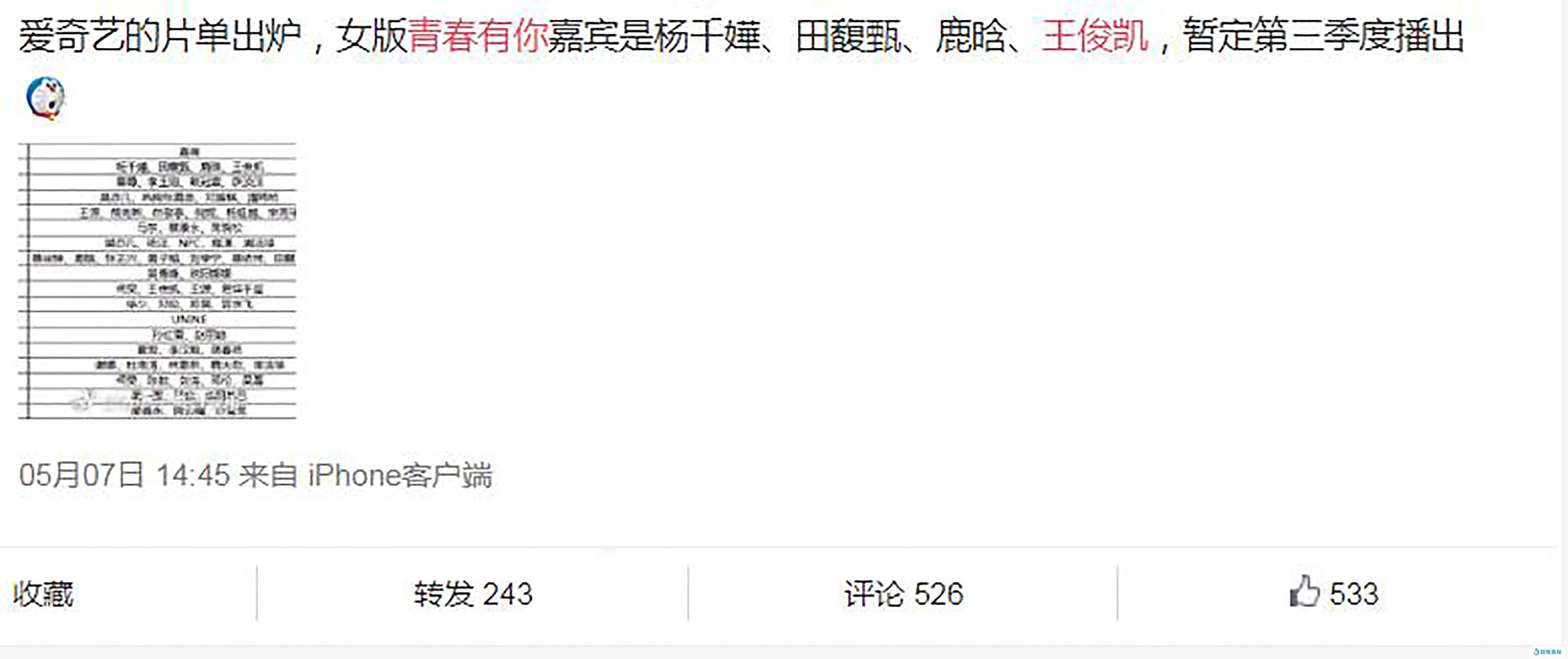 关键词:王俊凯 杨千嬅 田馥甄 鹿晗 蔡徐坤