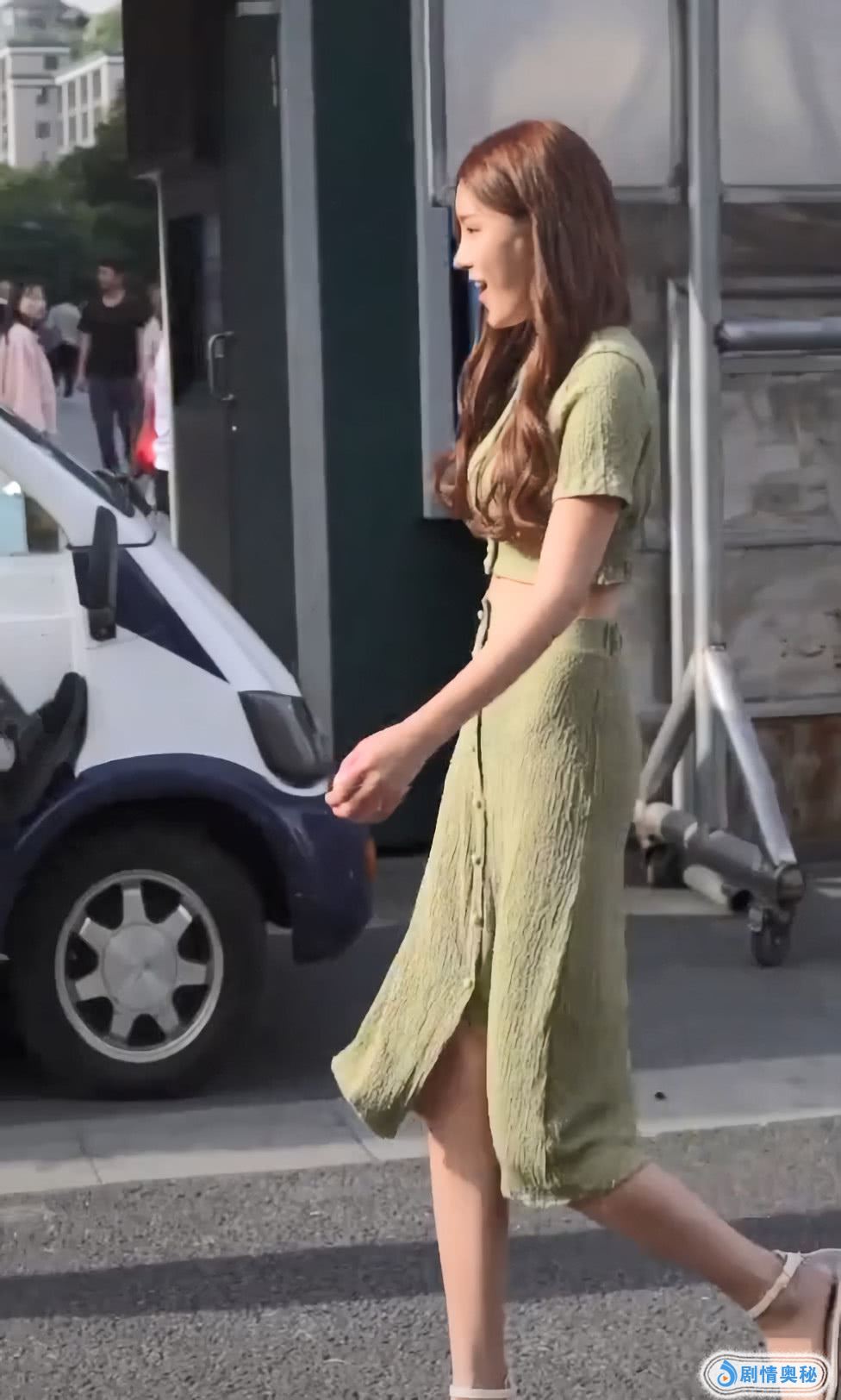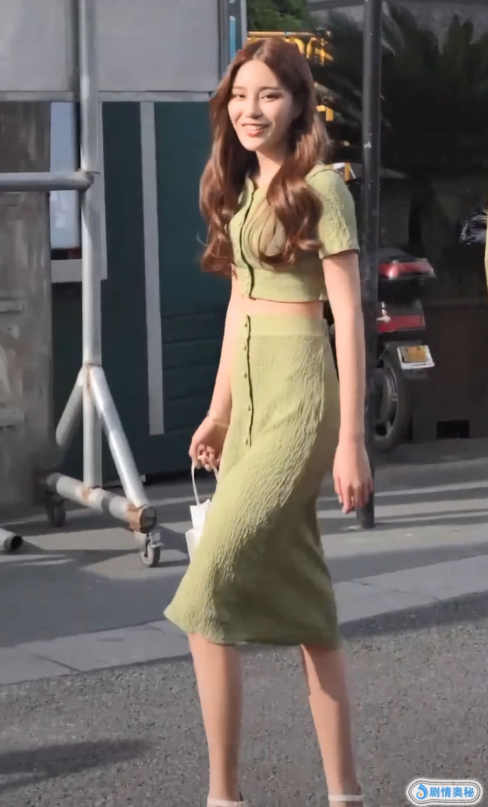 侧面看上去她的身材也好,这“树皮裙”中间是这种纽扣的装饰,走路的时候还会开叉,也算是有点小特别了,真的太好看了!