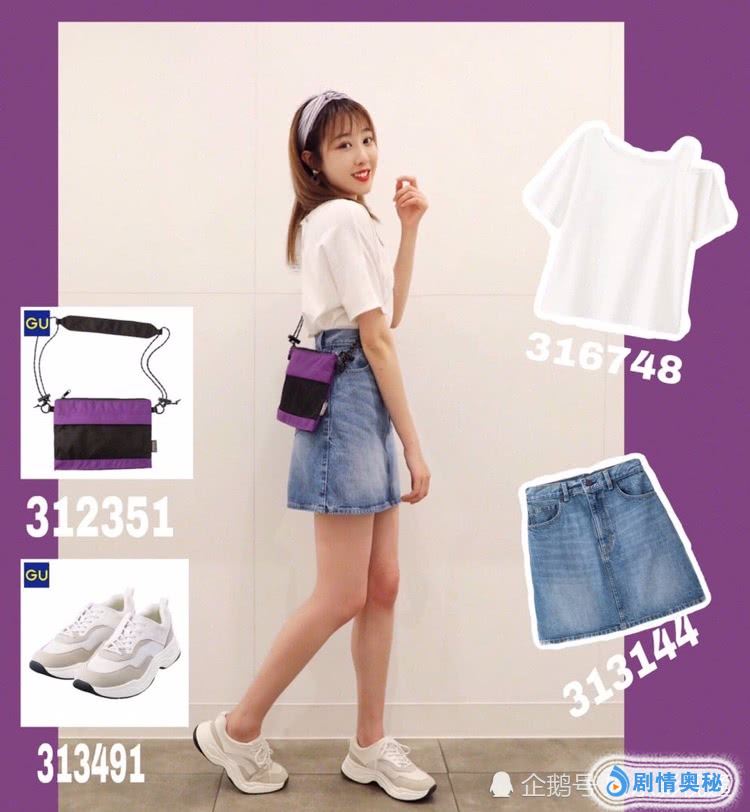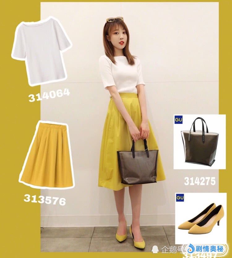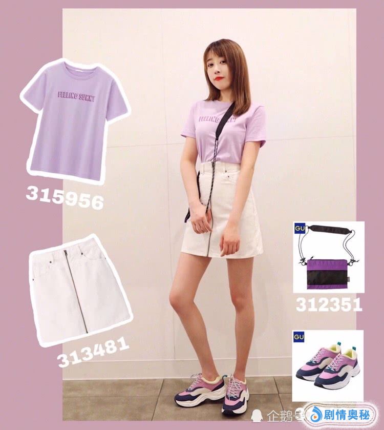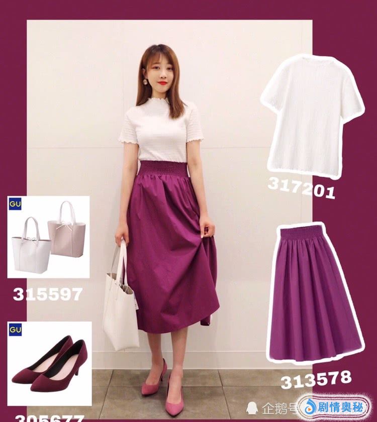 白色提花T+紫色收腰长裙+紫色高跟鞋。GU对色彩的掌握真的非常的棒,很多鲜艳亮丽的颜色让人穿上一点也不会俗气,收腰设计衬托曲线,搭配修身长衣,清新又文艺。