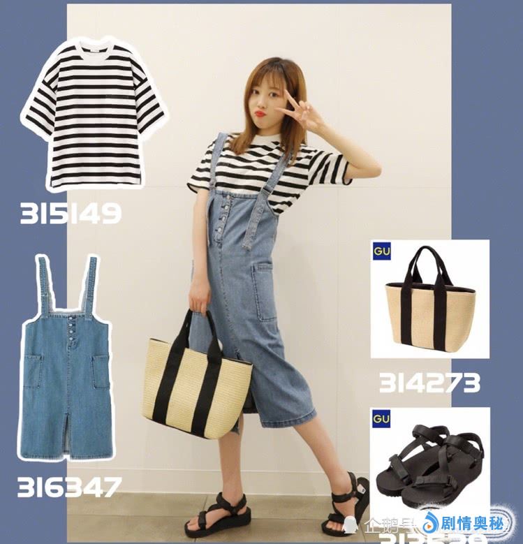 条纹T恤+牛仔背带裙+黑色凉鞋。非常减龄的一套,纯棉百搭条纹T恤搭配宽宽大大的牛仔背带裙,感觉下一秒就要去儿童乐园,条纹T恤妥妥的搭配神器。