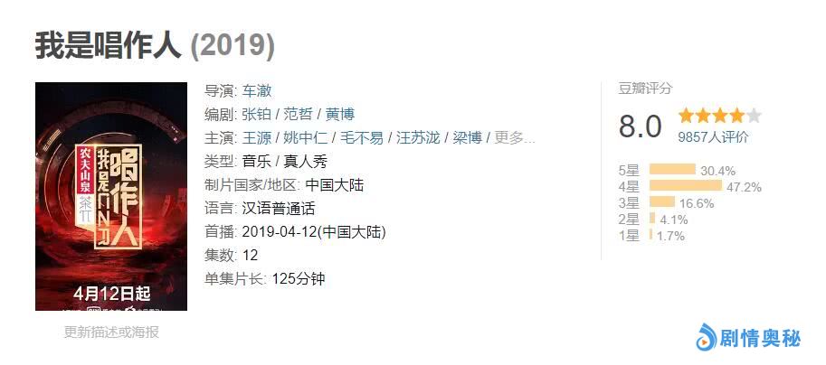 除此之外,另一档全新的音乐类节目《我是唱作人》开播后也获得一致好评,评分高达8.0,超过《歌手2019》,这档节目的亮点在于“原创”,无论你之前有什么样的成绩,在节目中标签通通撕掉,回归音乐最原始的样子。