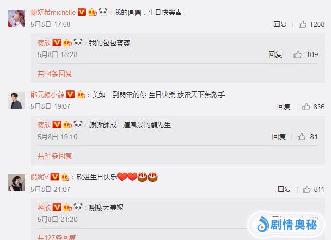 在蒋欣的微博下送祝福的都是一些粉粉丝们,不过也有几位明星送上了自己的祝福,有陈乔恩,倪妮还有郑元畅等,能在生日的时候收到祝福也是一件很开心的事了,并且一些官微也给蒋欣送上了祝福,也是很欣慰了。