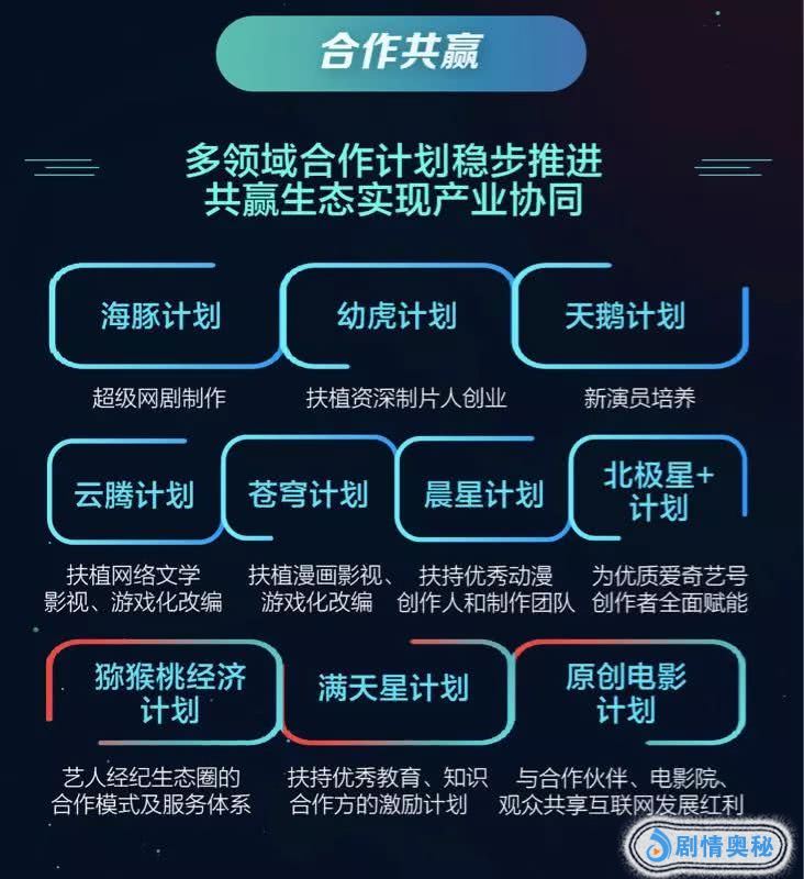 在此之前,爱奇艺多领域的合作计划已经全面铺开,包括超级网剧制作的“海豚计划”,扶植资深制片人创业的“幼虎计划”,新演员培养的“天鹅计划”,扶植网络文学影视、游戏化改编的“云腾计划”,扶持漫画、游戏改编的“苍穹计划”等七个合作计划。