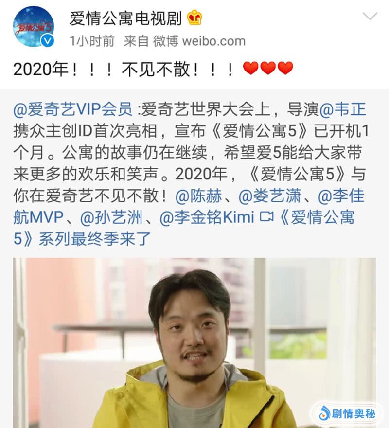 5月9日下午,在某网络平台搞的世界大会上,导演韦正携手众主创人员亮相,并正式宣布《爱情公寓5》已经开机1个月了,它也将是本系列剧的最后一季,预计将在明年与观众见面。