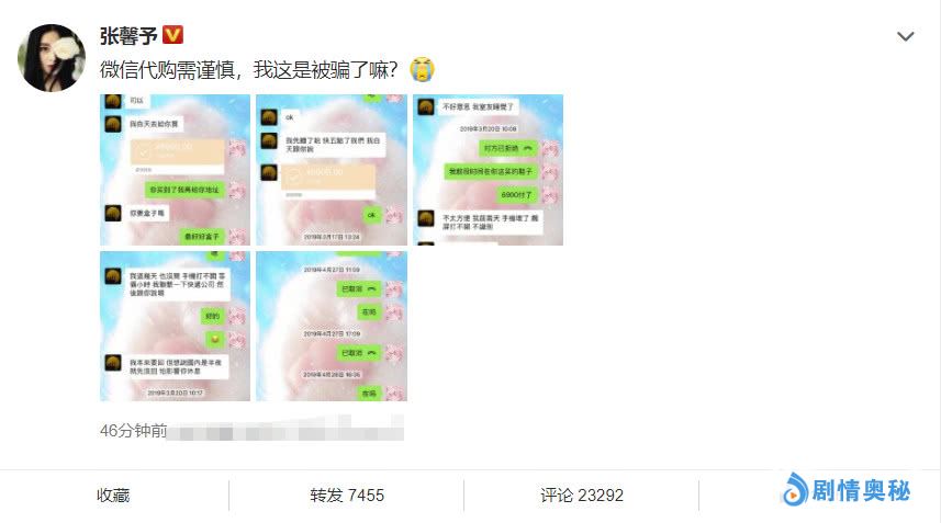 从照片中的截图其实不难发现,一开始的时候双方都是十分的客气,客气来客气去的表达的方式就像是真正的一次购物,甚至张馨予也是很坦率的直接把钱打过给对方,可见张馨予对于这一次找到的代沟还是十分的相信,甚至是都没有想到说是这一位代沟可能会欺骗她。相反的还选择继续相信自己找到的这位代购,其实是没有问题的,