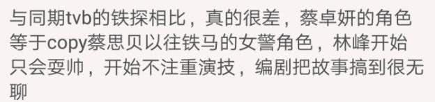 网友主要吐槽的是剧情不连贯,片头片尾用回忆和预告拉长时间,蔡卓妍的演技不在线,林峯也只会耍帅等。