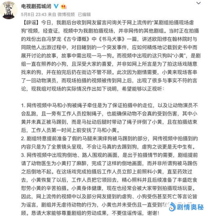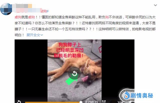 一牵扯到这两个字,那是直接就能引起爱狗人士的重视啊。那是瞬间就能把人给撕了,在视频中,据路透的人说,是为了拍戏,让马踢狗,然后狗受伤,歪歪斜斜的站不住身子,非常的可怜,和让人心痛。事情传出后,讨伐的声音越来越多,抵制的声音也越来越多,后来剧组在晚上11点的时候,就连夜编辑长文来解释这个事情。