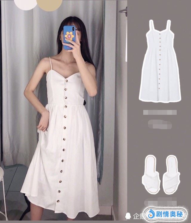白色吊带裙。夏天必备的吊带长裙,这件小个子很好驾驭,戴个草帽,就是度假风,裙子的版型的非常的nice,腰部设计拉长了整体的比例,显得腿很长,裙身的扣子设计增加了视觉效果,看上去很时尚。