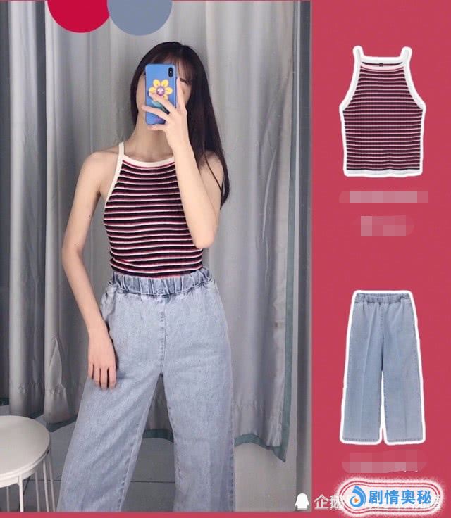 条纹吊带+阔腿牛仔裤。上紧下松的穿法,是超级显瘦的,显得腿部比例非常的棒,这件吊带颜色搭配很棒,红黑白的细条纹,视觉上就非常的显瘦,对于平胸女孩也是很友好的。