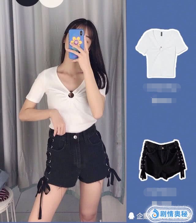白色低领短袖+黑色短裤。这件短袖领口的设计很别致,采用圆孔带着一点点的性感,裤子侧边都是绑带设计,这一整套都是非常不容易撞衫的穿搭,充满着设计感,