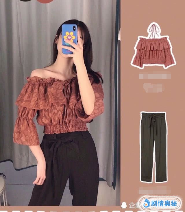 一字肩+阔腿长裤。这件上衣看着就很有高级感,颜色非常的好,还带着点亮丝,可挂脖式也可一字领,非常的实用。裤子的颜色也很特别,腰围也很合适,裤子的版型,也非常的别致,很显腿细。