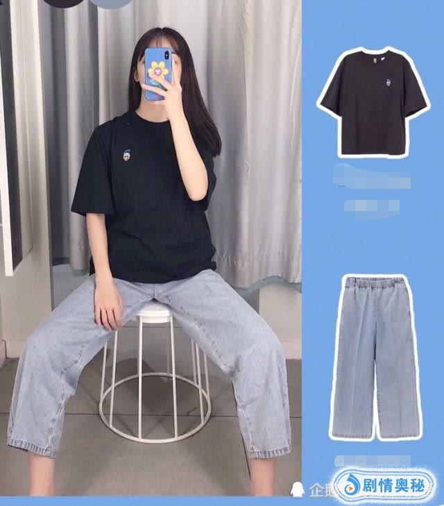 唐老鸭T恤+阔腿牛仔裤。非常简单休闲的一套搭配,这件T恤是属于深灰色,挺宽松很舒服。这件阔腿裤对于梨形身材真的是非常的友好,长度刚刚好,腰围也非常的合适。