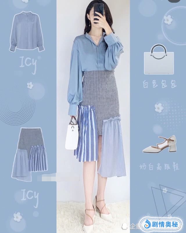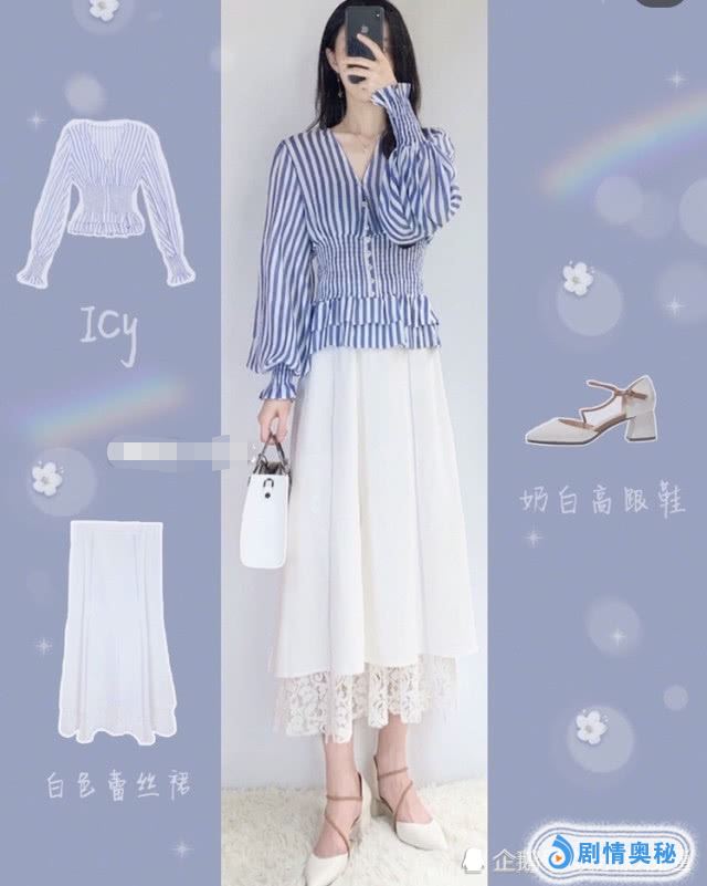 条纹雪纺衬衫+白色半身裙。这件蓝白条纹非常适合夏天,显得很有气质,腰身是收紧的,非常显腰细,材质也非常舒服,面料更是高级感满满。搭配这件白色半裙,非常的亮眼耐看,绝对是办公室最靓的仔。